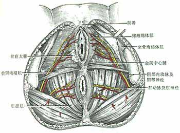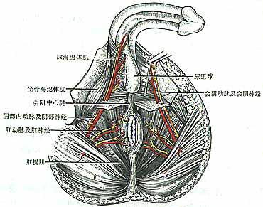 1、淺層結(jié)構(gòu) 皮膚被以陰毛,富有汗腺及皮脂腺。淺筋膜分為淺、深兩層,淺層即脂肪層,但含脂肪較少,深層即膜樣層,又稱淺會(huì)陰筋膜(Colles筋膜),覆蓋于會(huì)陰肌淺層及各海綿體表面,向前延續(xù)于陰囊肉膜、淺陰莖筋膜以及腹前外側(cè)壁的淺筋膜深層(Scarpa筋膜);兩側(cè)附著于恥骨弓和坐骨結(jié)節(jié)下緣;向后在會(huì)陰淺橫肌后緣處與尿生殖膈上、下筋膜相愈著;在中線上還與會(huì)陰中心腱和男性的尿道球中隔相愈著。