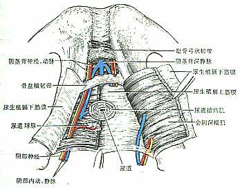 尿生殖三角肌以及覆蓋于它們的尿生殖膈上、下筋膜,共同構(gòu)成尿生殖膈urogenital diaphragm,有封閉盆膈裂孔、加固盆底的作用。尿生殖膈上、下筋膜的前、后緣明顯增厚,前緣附著于兩恥骨下支之間,形成會(huì)陰橫韌帶或骨盆橫韌帶,它與恥骨弓狀韌帶之間圍成一裂隙,內(nèi)有陰莖(或陰蒂)背深靜脈穿行。尿生殖膈上、下筋膜的兩側(cè)均附著于恥骨弓上,其后緣與淺會(huì)陰筋膜愈著,并向后移行于盆膈下筋膜。