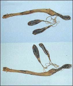 【生藥材鑒定】:海狗腎藥材來源不一,商品復(fù)雜,一般所用進口海狗腎(品種未定)為干燥的陰莖及睪丸。陰莖里長圓枚形,先端較細(xì),長28~32厘米,干縮有不規(guī)則的縱海及凹槽,有一條縱向的筋。外表黃棕色或黃色,雜有褐色斑塊。后端有一長圓形、干癟的囊狀物,約4 x3厘米,或有黃褐色毛。睪丸二枚,扁長圓形,棕褐色,半透明,各有一條細(xì)長的輸精管與陰莖末端相連。輸精管黃色、半透明,通常纏繞在陰莖上。副睪皺縮,附在睪丸的一側(cè),乳黃色。以形粗長,質(zhì)油潤,半透明,無腥臭者為佳。 |
